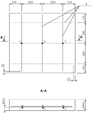 7.2 Образцы изготавливают из тяжелого бетона средней плотностью 2500 кг/м3, класса В60 с одиночным армированием сеткой с поперечными и продольными стержнями 3Ø10-АШ. Толщина защитного слоя бетона 20 ± 1 мм. Для подъема и монтажа образцы должны иметь монтажные петли.