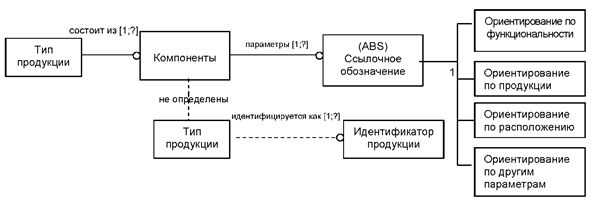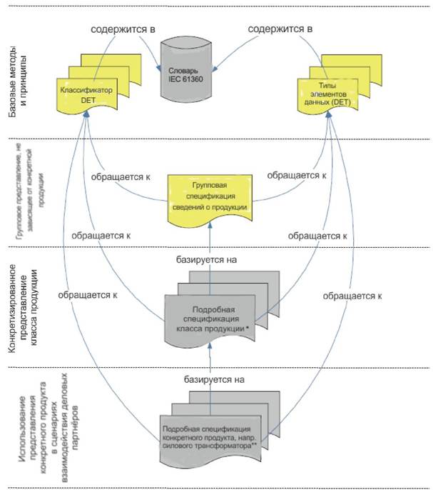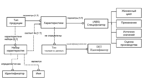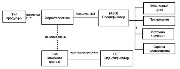 Переход от громоздких описаний продукции к описаниям предварительно определённых семантических типов элементов данных является ключевым фактором эффективного и безопасного компьютеризованного бизнеса. Отношения между типами элементов данных, ассоциируемым словарём данных и различными спецификациями схематически отображены на рисунке 1.