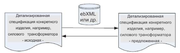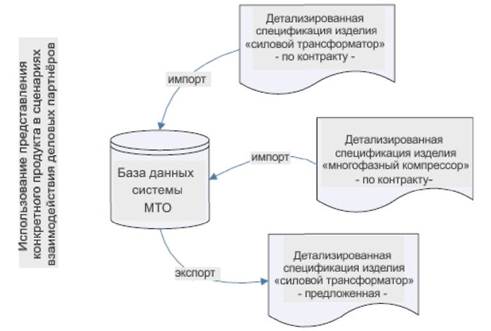 Если спецификация информации представлена в виде компьютерного шаблона, то она ассоциируется со схемой информационного обмена; это может быть, например, схема на языке XML или любой другой тегированный формат компьютерного файла; а содержимое детализированной спецификации конкретного продукта может легко использоваться для организации импорта и экспорта определённых значений данных, хранящихся в БД систем материально-технического обеспечения (МТО), как показано на рисунке 3.