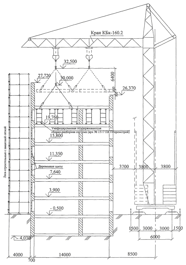 1.6 В качестве основных строительных механизмов, используемых для производства демонтажных работ, применяются башенный кран КБк-160.2 с lсmp. = 25 м и строительный подъемник ТП-14. Возможны варианты использования и других грузоподъемных механизмов, имеющихся в наличии в строительных подрядных организациях. Окончательный вариант механизации работ по разборке материалов и демонтажу конструкций перекрытий устанавливается проектом производства работ.