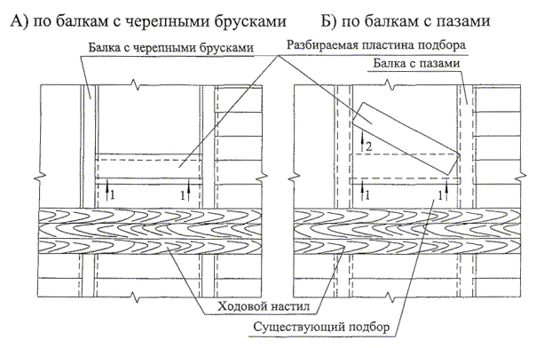 2.7 Подбор снимают при помощи ломика с ходовых настилов и укладывают в пакеты на прокладки, уложенные на балки перекрытия. При наличии балок с пазами подбор разбирают, поворачивая в горизонтальной плоскости перекрытия до полного выхода его концов из пазов балок.