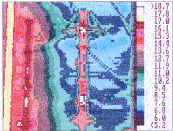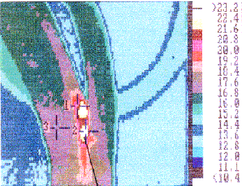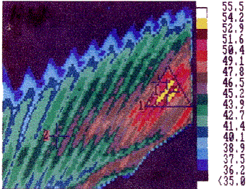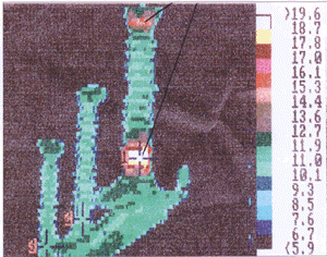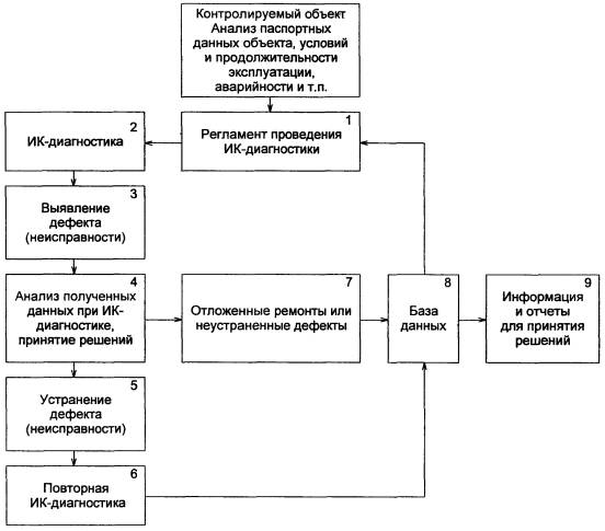Выявление дефекта (3) должно осуществляться по возможности на ранней стадии развития, для чего прибор ИКТ должен обладать достаточной чувствительностью даже при воздействии ряда неблагоприятных факторов, могущих наблюдаться в эксплуатации (влияние отрицательных температур, запыленности, электромагнитных полей и т.п.). При анализе результатов ИК-диагностики (4) должна осуществляться оценка выявленного дефекта и прогнозирование возможностей его развития и сроков восстановления.