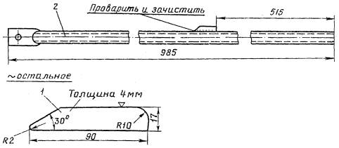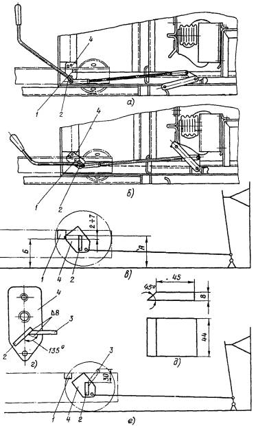 3. При размере зацепления менее 7 мм изготовить и приварить дополнительный упор 3 к упору 2, расположенному на рычажной планке 4 (см. рис. 29, г) в следующей последовательности: