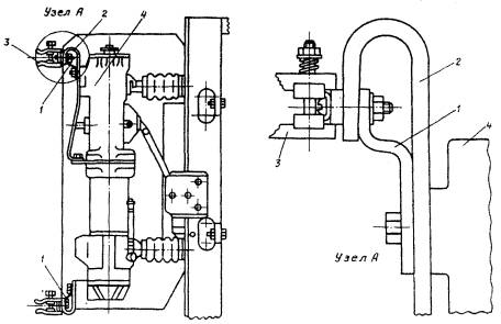 - дополнительный упор 3 приварить к рычажной планке привода заземляющего разъединителя, как показано на рис. 29, г. Для обеспечения достаточной механической прочности упор 3 должен быть приварен к упору 2 и рычажной планке 4;