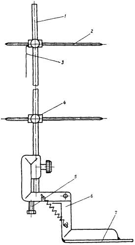 Конструктивно устройство выполнено следующим образом (рис. 20). Ломающаяся рамка 6 изготовлена из стального уголка размером 20´20 мм. К рамке прикрепляется направляющая трубка 1, служащая для перемещения по ней сухарей 4 с указателями 2 и для хранения указателей в транспортном положении.