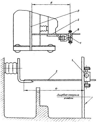 Наладка и регулирование контактов производятся при полностью снятом напряжении, наложенном заземлении и выполнении всех мероприятий по безопасности персонала согласно требованиям Правил техники безопасности по эксплуатации электроустановок. Выключатель выкатывается в ремонтное положение, после чего защитные шторки ячейки необходимо открыть. Контроль и, если необходимо, регулирование по высоте производятся следующим образом (рис. 21). Устройство устанавливается на полоз ячейки против контактов крайней фазы, регулируется упорный болт относительно порога ячейки. Затем центрируются указатели устройства относительно верхних и нижних (на рис. 21 показано применительно к нижним контактам) неподвижных контактов одной фазы и сравниваются с положением контактов выключателя, при этом устройство должно быть установлено на ту же плоскость, что и колеса тележки выключателя. Если несоосность контактов превышает 4 мм, то необходимо произвести их регулирование. Для контроля глубины захода контактов (рис. 22) необходимо приложить направляющую трубку 1 устройства к ламелям 8 выключателя, рамку при этом можно снять, а конец указателя упереть в ребро 9 выкатной тележки с выключателем.