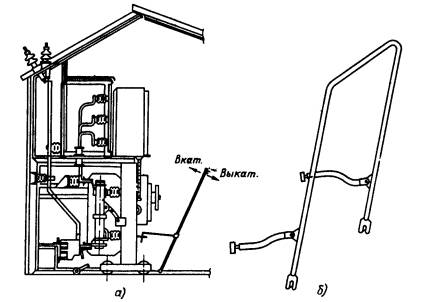 При отключении заземляющего разъединителя (см. рис. 29, а) рычажная планка 4 с упором 2 поворачивается на угол, близкий к 45°, и выкатная тележка со скобой 1 свободно проходит над ним.