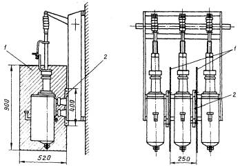 Приспособление надевается на подвижные контакты выкаткой тележки в соответствии с рис. 19, поверхности резиновых подушек приспособлений смазываются тонким однородным слоем смазки, затем выкатная тележка вкатывается в ячейку и останавливается за 5 - 6 см до фиксированного рабочего положения. После выкатывания ее в ремонтное положение по следу на резиновых подушках приспособлений определяется степень соосности подвижных и неподвижных разъединяющих контактов. Проверку рекомендуется производить два раза: перед первым вкатыванием все ламели подвижных контактов отжимаются в крайнее нижнее положение, а перед вторым - в крайнее верхнее положение (в пределах свободного хода ламелей). В промежутке между первым и вторым вкатыванием слой смазки на приспособлении трогать не следует.