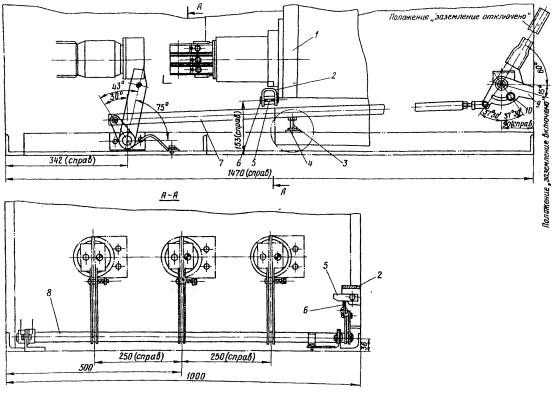 На рис. 29 а, в показаны заземляющий разъединитель с приводом и рама выкатной тележки (левая часть). При включенном заземляющем разъединителе (см. рис. 29, б и в) скоба 1, расположенная на раме выкатной тележки, упирается в упор 2, расположенный на рычажной планке 4 привода заземляющего разъединителя, что препятствует вкатыванию выкатной тележки в рабочее положение.