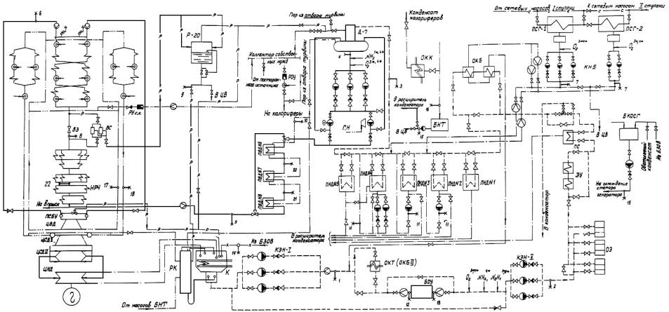 16 - КК; 17 - ХПП; 18 - ГПП; 19 - ОСГ; 20 - ПВД N 6; 21 - ПВД N 7; 22 - НРЧ