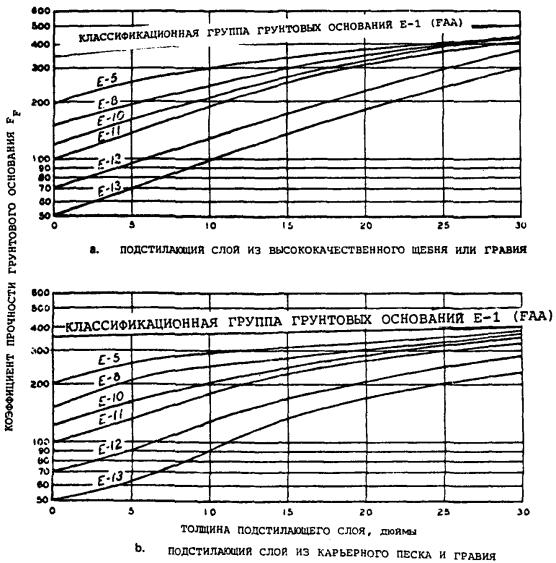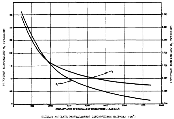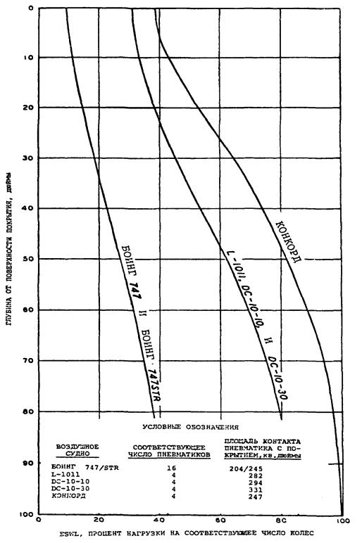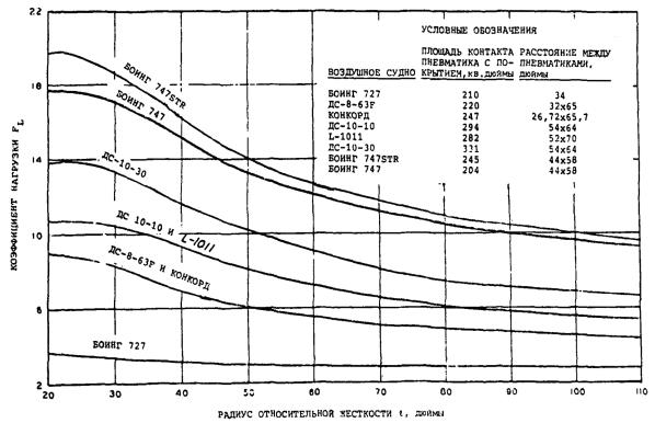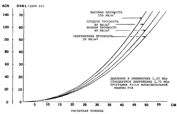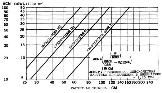 1.1.2.3 Для облегчения использования этого метода изготовители воздушных судов опубликуют в описаниях характеристик своих воздушных судов значения ACN, вычисленные для двух различных масс (максимальной массы на перроне и репрезентативной массы пустого самолета), как на жестких, так и на нежестких покрытиях для четырех стандартных категорий прочности грунтового основания. Тем не менее, для удобства пользования, в дополнении С Приложения 14 и добавлении 5 Руководства приведена таблица значений ACN нескольких воздушных судов. Необходимо отметить, что при определении ACN используется «статическая» масса и не вносится поправка на увеличение нагрузки вследствие динамических эффектов.