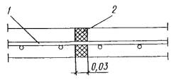 Для удержания асфальтовых планок в проектном положении их временно закрепляют металлическими штырями диаметром 16 ... 18 мм длиной 25 ... 30 см. Их забивают в грунт через слой щебеночной подготовки по бокам асфальтовых планок. На асфальтовые планки и на «сухари» (бетонные бруски толщиной 6 см) укладывают металлическую сетку с ячейками 20´20 см из стержней диаметром 6 мм. Поверх арматуры на нижние ряды асфальтовых планок устанавливают такие же планки, которые связывают с нижними, как показано на рис. 2. В местах сопряжения плит укрепления с конструкциями опор также устанавливают асфальтовые планки (антисептированные доски).