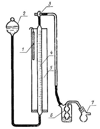 1 - термометр; 2 - груша уравнительная; 3 - кран трехходовой; 4 - бюретка газовая; 5 - кожух стеклянный; 6 - склянка Дрекселя; 7 - колба реакционная