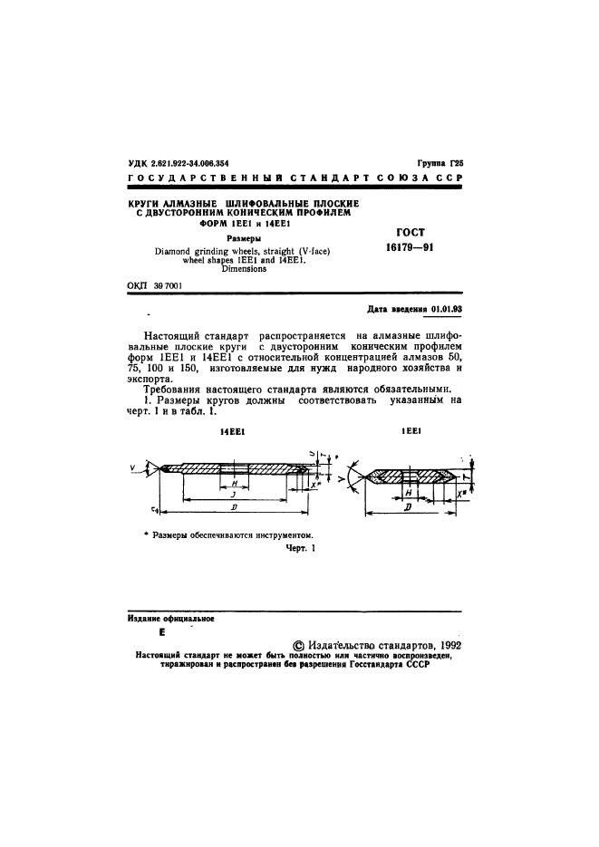 | Область и условия применения: | Настоящий стандарт распространяется на алмазные шлифовальные плоские круги с двусторонним коническим профилем форм 1ЕЕ1 и 14ЕЕ1 с относительной концентрацией алмазов 50, 75, 100 и 150, изготовляемые для нужд народного хозяйства и экспорта |