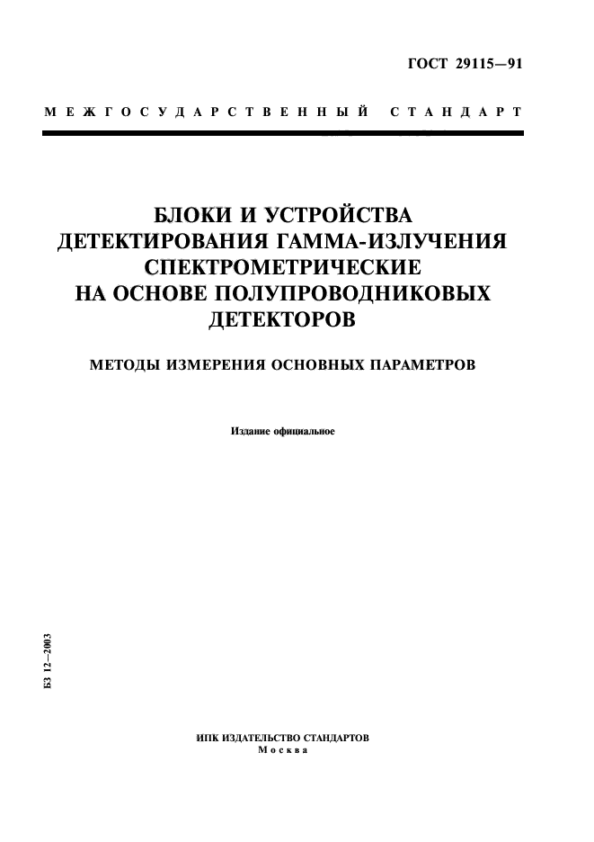 Настоящий стандарт распространяется на спектрометрические блоки и устройства детектирования гамма-излучения по ГОСТ 27173, выполненные на основе полупроводниковых детекторов, и устанавливает методы измерения их основных параметров: коэффициента преобразования; отношения пик/комптон; энергетического разрешения; отношения ПШДВ/ПШПВ; чувствительности регистрации; максимальной статистической загрузки; диапазона энергий регистрируемого излучения; интегральной нелинейности функции преобразования; нестабильности (амплитуды сигнала во времени); времени установления рабочего режима; времени непрерывной работы