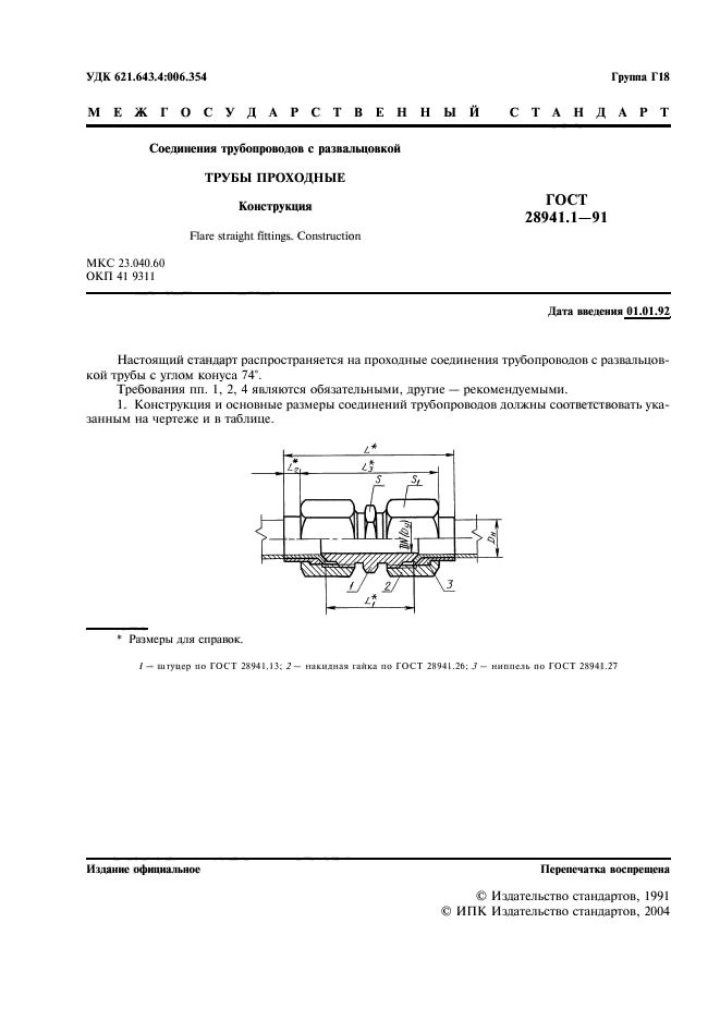 | Область и условия применения: | Настоящий стандарт распространяется на проходные соединения трубопроводов с развальцовкой трубы с углом конуса 74 град. |