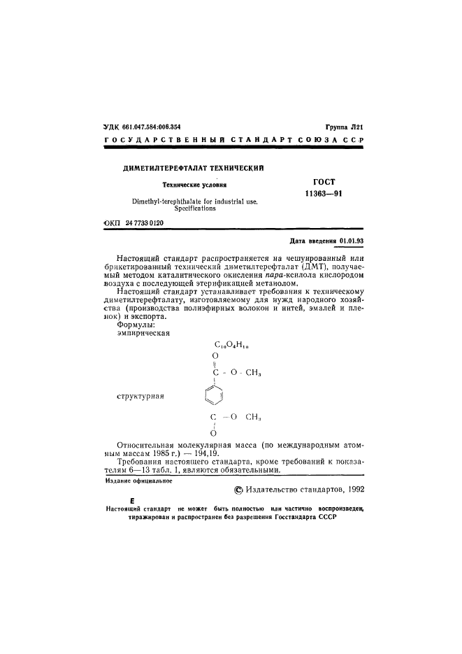 Настоящий стандарт распространяется на чешуированный или брикетированный технический диметилтерефталат, получаемый методом каталитического окисления пара-ксилола кислородом воздуха с последующей этерификацией метанолом