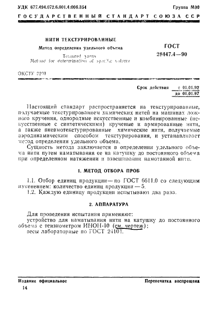| Область и условия применения: | Настоящий стандарт распространяется на текстурированные, получаемые текстурированием химических нитей на машинах ложного кручения, однородные искусственные и комбинированные (искусственные с синтетическими) крученые и армированные нити, а также пневмотекстурированные химические нити, получаемые аэродинамическим способом текстурирования, и устанавливает метод определения удельного объема |