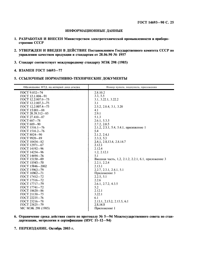 Стандарт не распространяется на КРУ: предназначенные для работы в пожаро- и взрывоопасных зонах; подвергающиеся действию газов, паров и химических отложений, вредных для изоляции; специальные (например, предназначенные для работы в сейсмоопасных зонах, на объектах атомной энергетики, а также в электротермических и передвижных установках, судовых распределительных устройствах, на экскаваторах); на сборные камеры одностороннего обслуживания; герметизированные с элегазовой изоляцией |