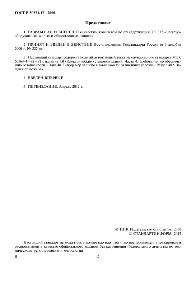 | Название рус.: | Электроустановки зданий. Часть 4. Требования по обеспечению безопасности. Глава 48. Выбор мер защиты в зависимости от внешних условий. Раздел 482. Защита от пожара |