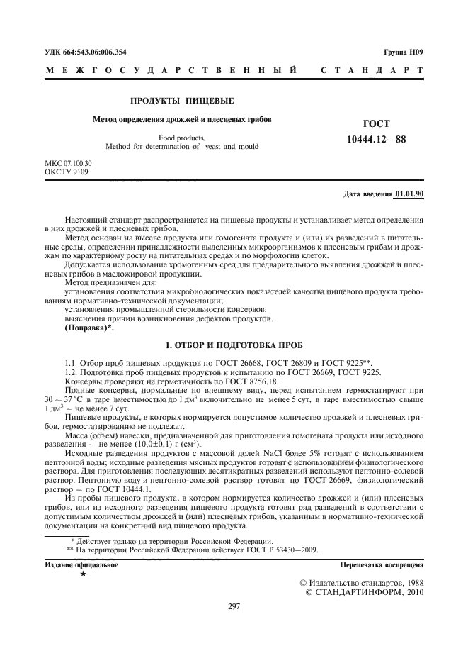 | Область и условия применения: | Настоящий стандарт распространяется на пищевые продукты и устанавливает метод определения в них дрожжей и плесневых грибов.