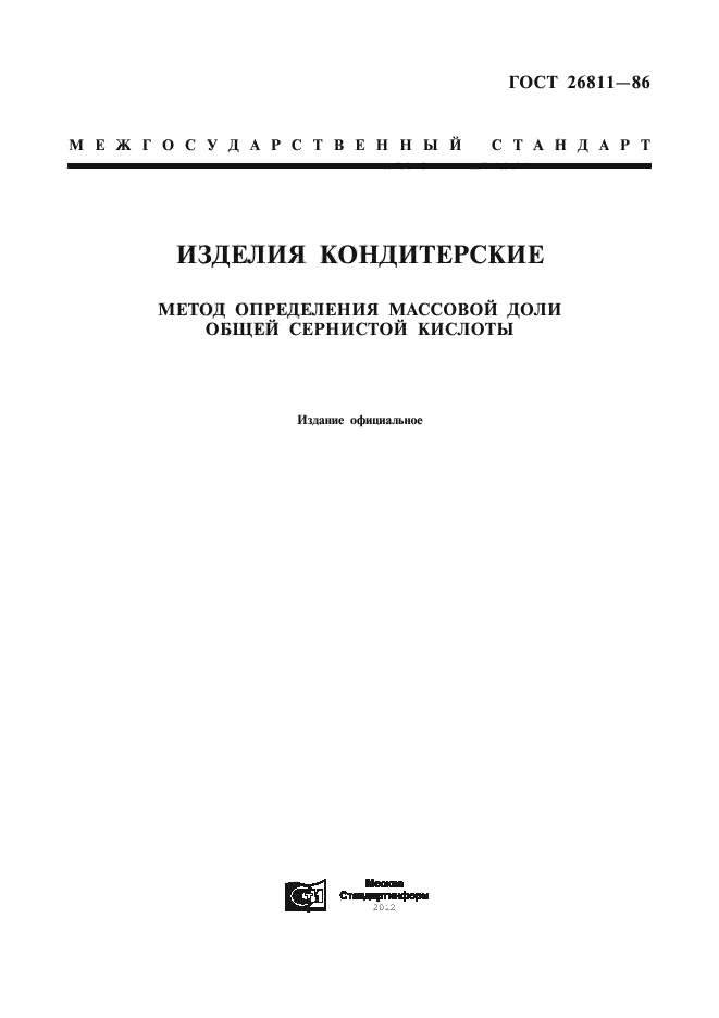 | Название англ.: | Confectionary. Method for determination of mass percentage of total sulphurous acid |