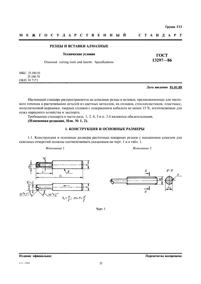 Настоящий стандарт распространяется на алмазные резцы и вставки, предназначенные для чистового точения и растачивания деталей из цветных металлов, их сплавов, стеклопластиков, пластмасс, полуспеченной керамики, твердых сплавов с содержанием кобальта не менее 15 %, изготовляемые для нужд народного хозяйства и экспорта