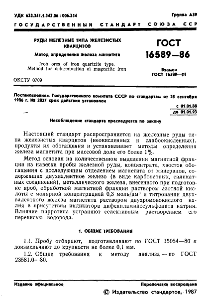 | Название англ.: | Iron ores of iron quartzite type. Method for determination of magnetite iron |