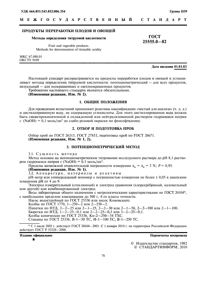 Настоящий стандарт распространяется на продукты переработки плодов и овощей и устанавливает методы определения титруемой кислотности: потенциометрический - для всех продуктов, визуальный - для неокрашенных и светлоокрашенных продуктов