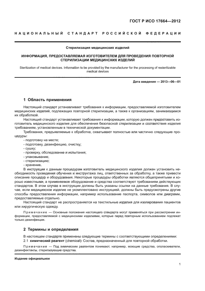 Настоящий стандарт устанавливает требования к информации, которую должен предоставить изготовитель медицинского изделия для обеспечения безопасной стерилизации и соответствия изделия требованиям, установленным в технической документации.