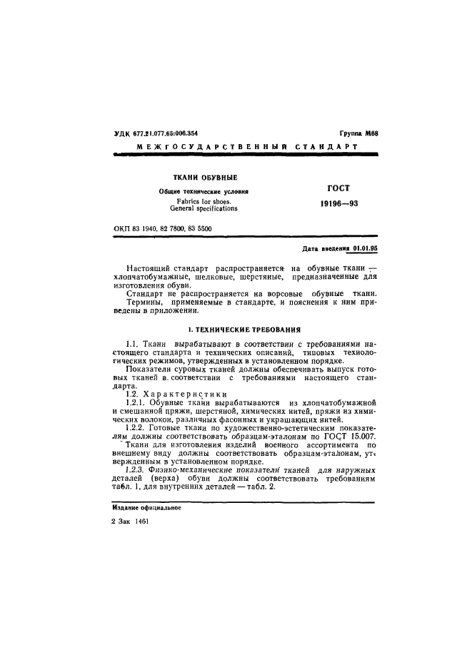 Настоящий стандарт распространяется на обувные ткани - хлопчатобумажные, шелковые, шерстяные, предназначенные для изготовления обуви.