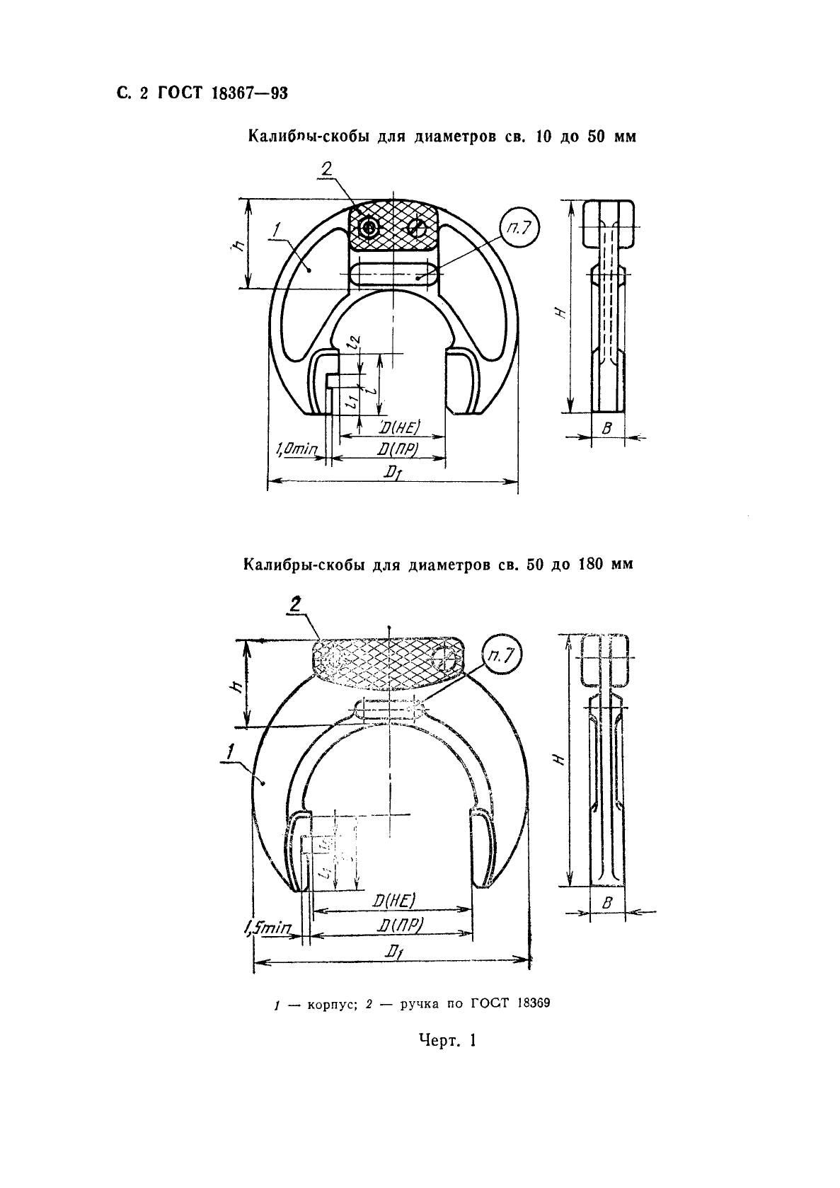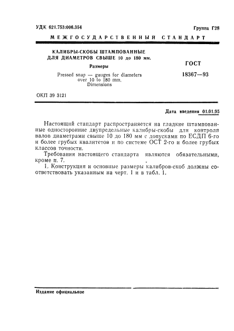 Настоящий стандарт распространяется на гладкие штампованные односторонние двупредельные калибры-скобы для контроля валов диаметрами свыше 10 до 180 мм с допусками по ЕСДП 6-го и более грубых квалитетов и по системе ОСТ 2-го и более грубых классов точности