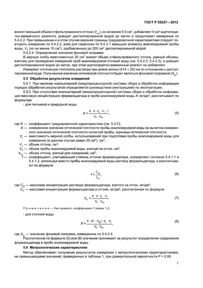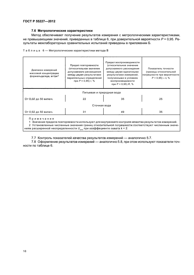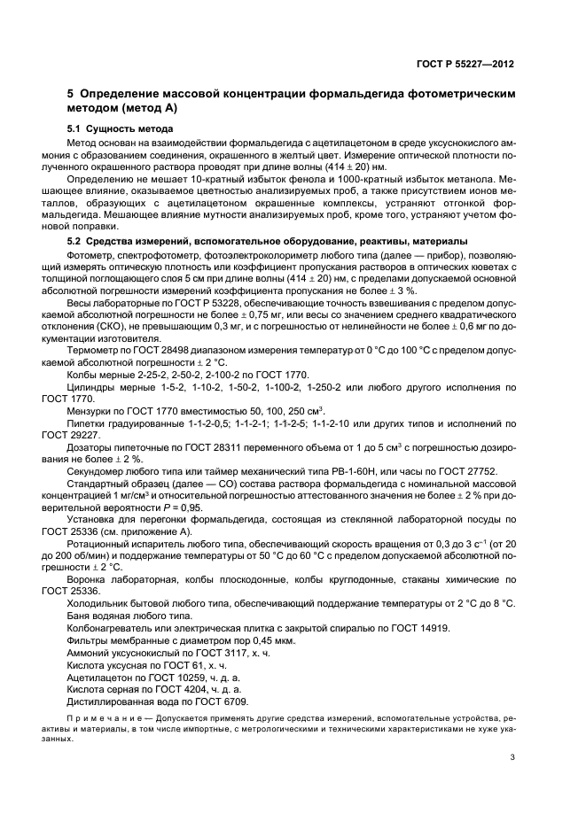 - фотометрический метод определения содержания формальдегида массовой концентрации от 0,025 мг/дм3 до 25 мг/дм3 в пробах питьевых и природных вод и массовой концентрации от 0,05 мг/дм3 до 400 мг/дм3 в пробах сточных вод (метод А);