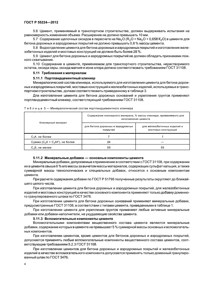Настоящий стандарт распространяется на цементы, изготавливаемые на основе портландцементного клинкера нормированного состава и применяемые в транспортном строительстве для изготовления бетонов дорожных и аэродромных покрытий, мостовых конструкций, железобетонных изделий, в том числе железобетонных труб, шпал, опор линий электропередач, бордюрного камня и др., а также для бетона дорожных оснований и укрепления грунтов, для которых специальные требования к минералогическому составу клинкера не предъявляются (далее – цементы), и устанавливает требования к цементам и компонентам их вещественного состава.