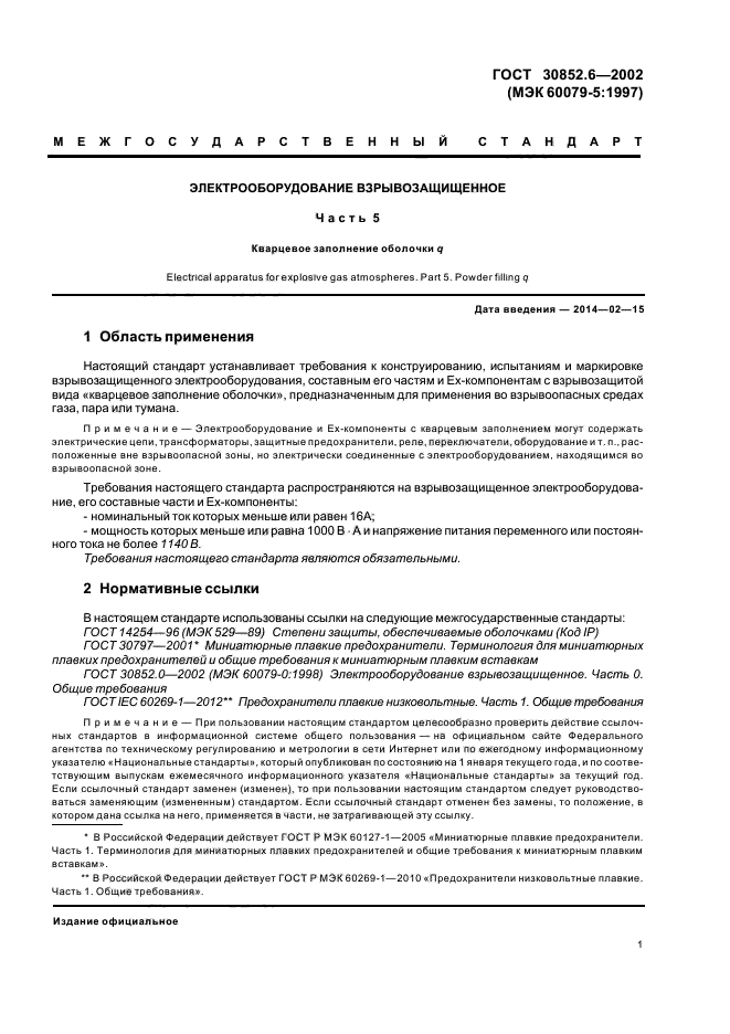 | Область и условия применения: | Настоящий стандарт устанавливает требования к конструированию, испытаниям и маркировке взрывозащищенного электрооборудования, составным его частям и Ех-компонентам с взрывозащитой вида «кварцевое заполнение оболочки», предназначенным для применения во взрывоопасных средах газа, пара или тумана.