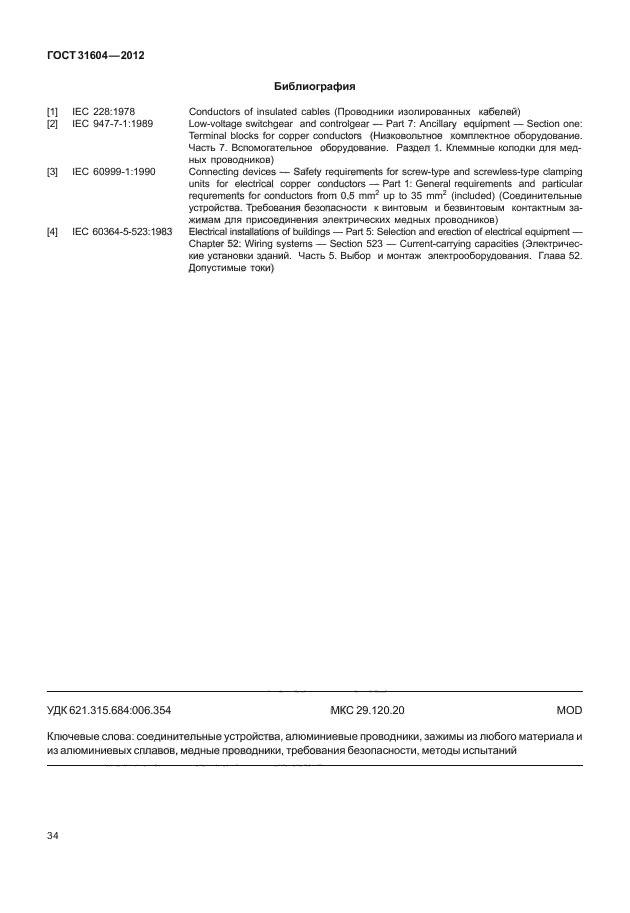 Стандарт не распространяется на зажимы: - присоединяемые методом обжатия, пайкой твердым и мягким припоями, сваркой; - цифровых или сигнальных цепей; - с плоскими штыревыми соединителями (оконцевателями) по ГОСТ IEC 61210; - обеспечивающие прямой контакт с жилой проводника путем прокалывания изоляции, по ГОСТ 31195.2.3; требующие скручивания жил соединяемых проводников, например со скрученными стыками по ГОСТ IEC 60998-2-4. Требования настоящего стандарта являются обязательными |