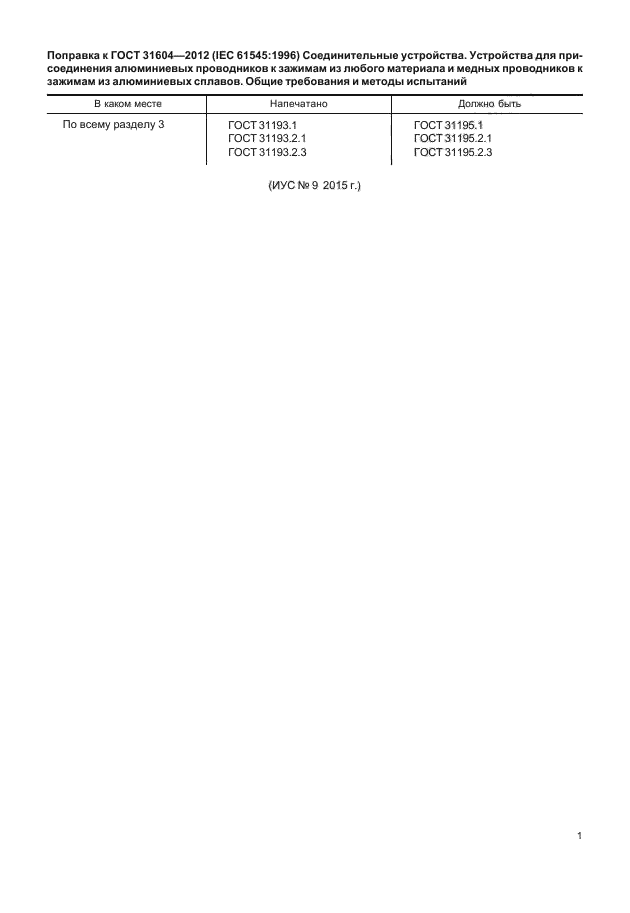 | Название англ.: | Connecting devices. Devices for the connection of aluminium conductors in clamping units of any material and copper conductors in aluminium bodied clamping units. General requirements and methods of tests |