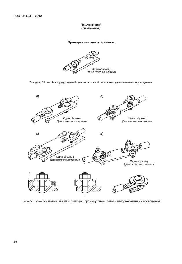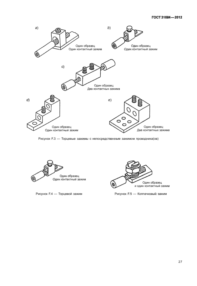 Настоящий стандарт распространяется на винтовые и безвинтовые контактные зажимы соединительных устройств из любого материала, выполненных как заодно с прибором, так и встроенными в прибор, предназначенные для присоединения алюминиевых проводников без специальной подготовки (с изолированными или неизолированными концами), плакированных медью (в соответствии с IEC 228 [1]), жестких (одно- и многожильных), номинальным сечением от 2,5 до 50 мм2 включительно и эквивалентных проводников AWG на номинальное переменное напряжение до 1000 В частоты до 1000 Гц включительно и постоянное напряжение до 1500 В.