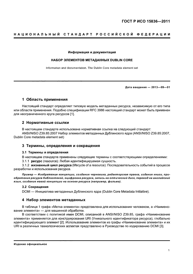 | Область и условия применения: | Настоящий стандарт определяет типовую модель метаданных ресурса, независимую от его типа или области применения. Подобно спецификации RFC 3986 настоящий стандарт может быть применен для неограниченного круга ресурсов |