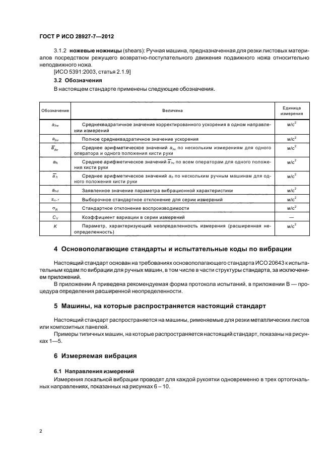 | Область и условия применения: | Настоящий стандарт устанавливает лабораторный метод определения параметров вибрационной характеристики вырубных и ножевых ножниц по измерениям вибрации на рукоятках. Результаты испытаний могут быть использованы для сравнения разных моделей машины одного вида.