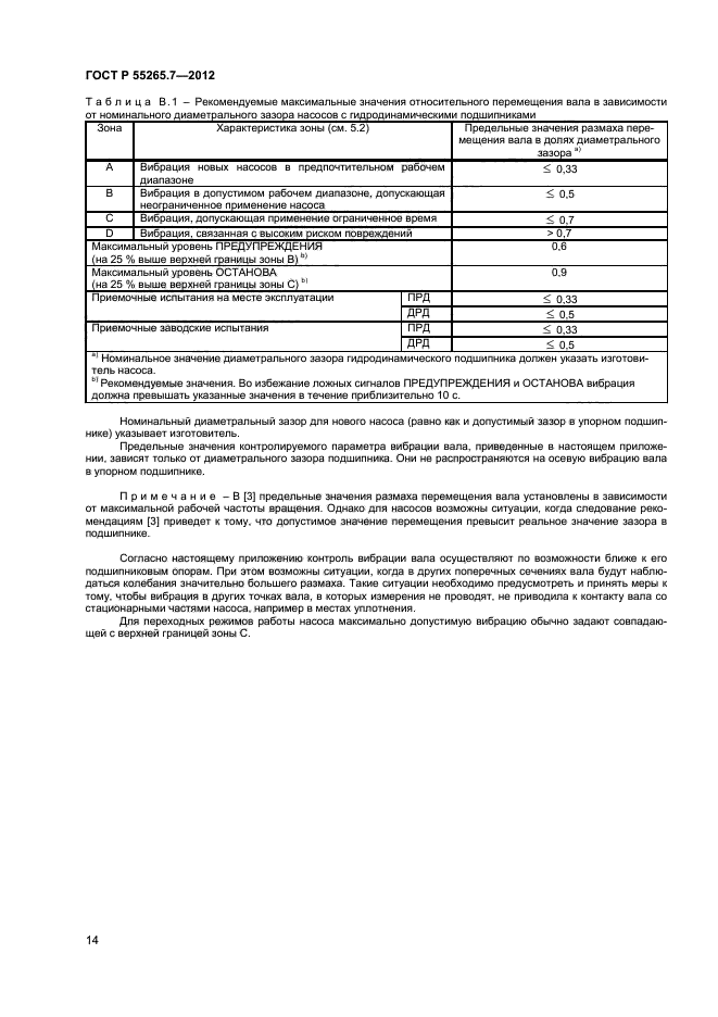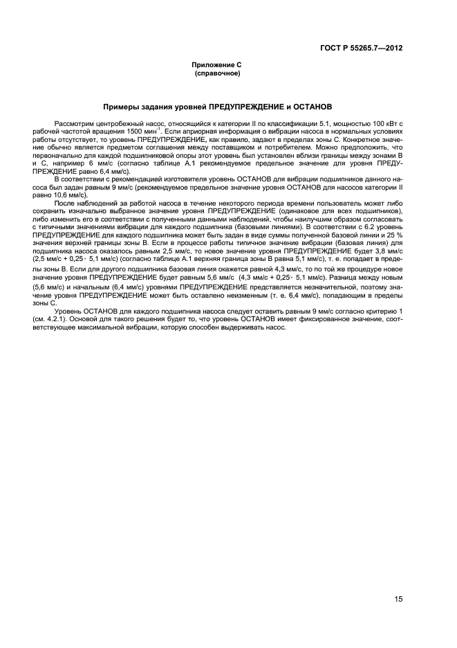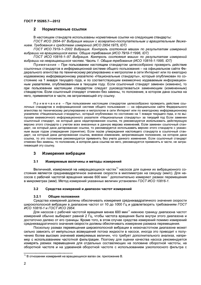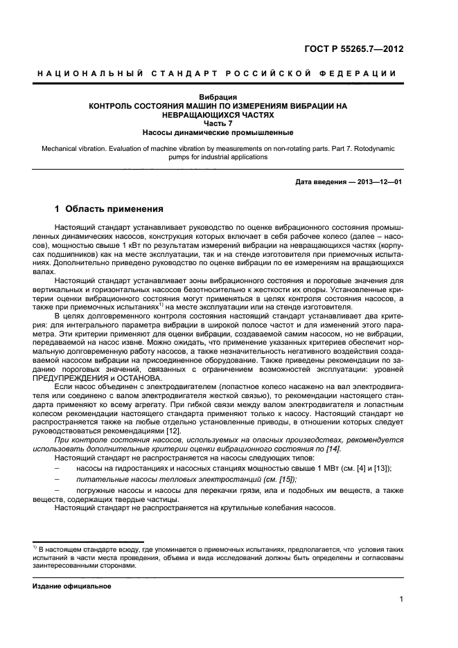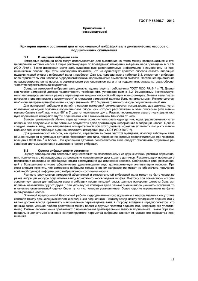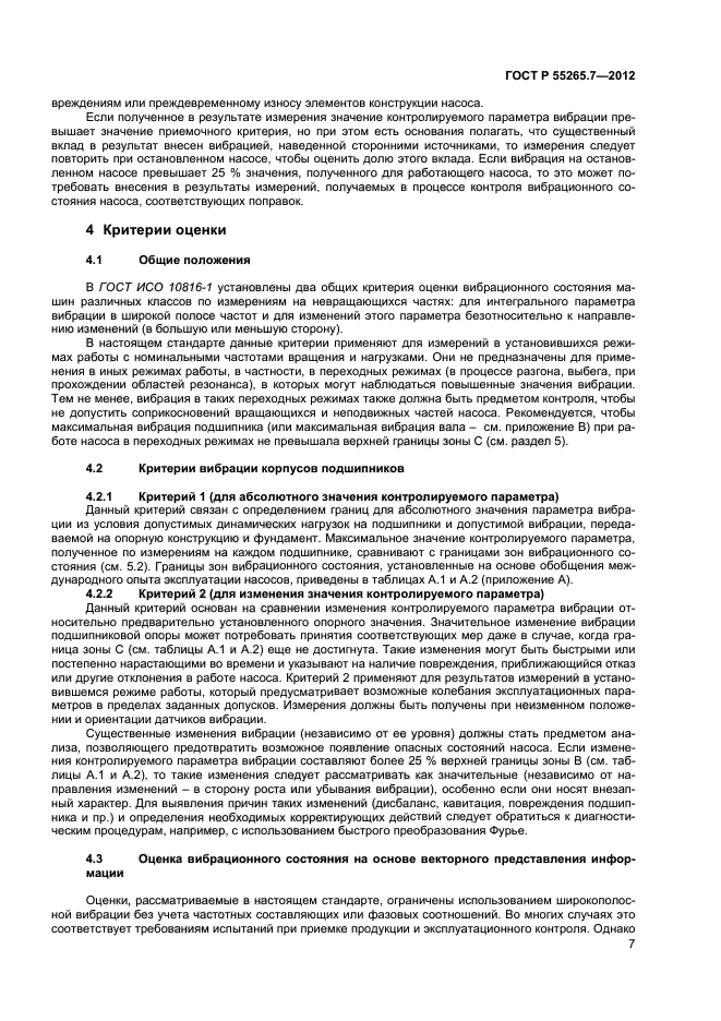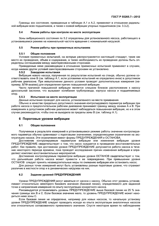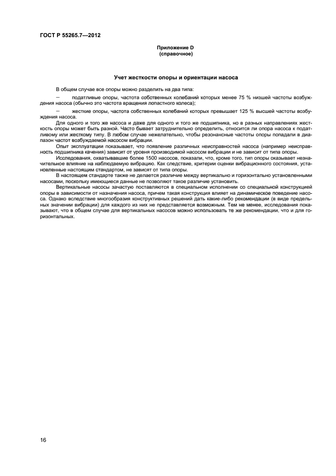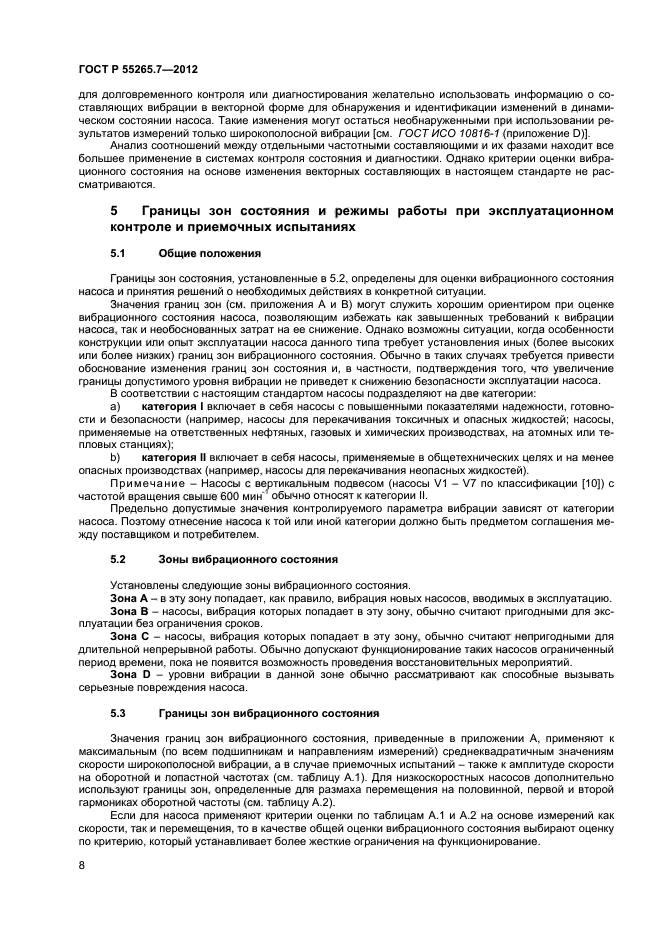 Настоящий стандарт устанавливает зоны вибрационного состояния и пороговые значения для вертикальных и горизонтальных насосов безотносительно к жесткости их опоры. Установленные критерии оценки вибрационного состояния могут применяться в целях контроля состояния насосов, а также при приемочных испытаниях на месте эксплуатации или на стенде изготовителя
