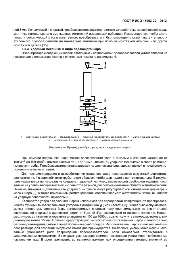 | Область и условия применения: | Настоящий стандарт устанавливает требования к методам ударной калибровки сравнением преобразователей поступательной вибрации с использованием измерений опорного ускорения, скорости или силы при заданном ударном возбуждении. Данные методы применимы в диапазоне длительности ударных импульсов от 0,05 до 8,0 мс и динамическом диапазоне (по пиковому значению ускорения) от 100 м/с кв. до 100 км/с кв. (в зависимости от длительности удара). Методы позволяют определять коэффициент преобразования по удару (отношение пиковых значений выходного сигнала преобразователя и измеряемого ускорения).