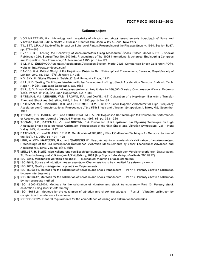 | Название рус.: | Вибрация. Методы калибровки датчиков вибрации и удара. Часть 22. Ударная калибровка сравнением с эталонным преобразователем |