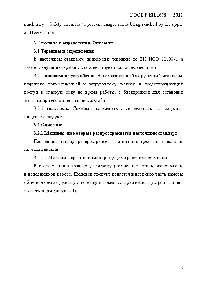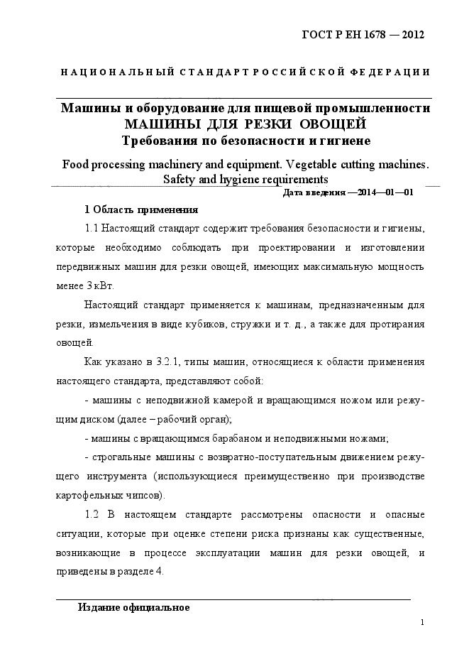 | Область и условия применения: | Настоящий стандарт содержит требования безопасности и гигиены, которые необходимо соблюдать при проектировании и изготовлении передвижных машин для резки овощей, имеющих максимальную мощность менее 3 кВт.