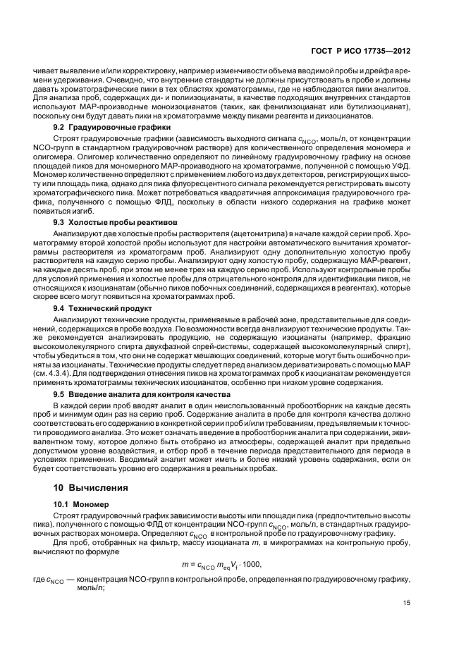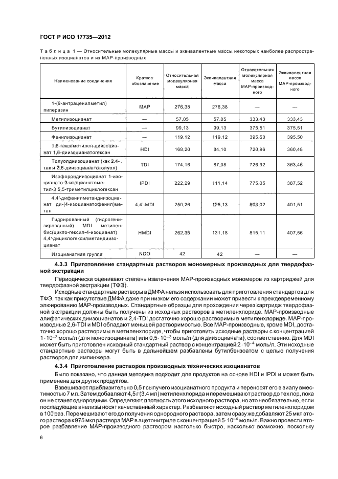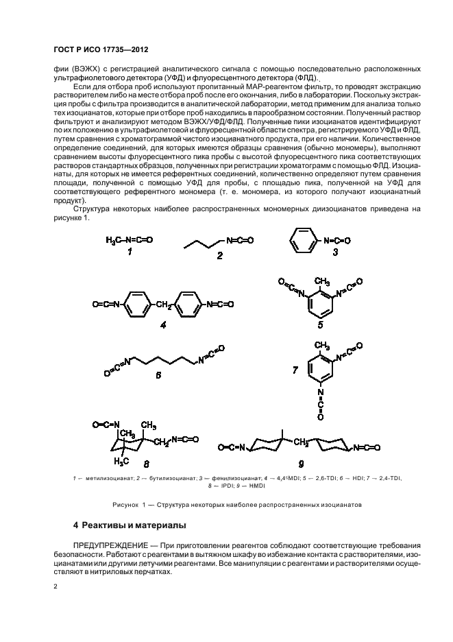 Настоящий стандарт применяют для определения различных органических соединений, содержащих функциональные NCO-группы, в том числе монофункциональных изоцианатов (например, фенилизоцианата), мономерных диизоцианатов [например, 1,6-гексаметилендиизоцианат (HDI)], толуолдиизоцианатов (TDI), 4,4`-дифенилметандиизоцианата (MDI), и изофорондиизоцианатов (IPDI), форполимеров [например, биурет- и изоцианурата (HDI)], а также промежуточных продуктов, образующихся в процессе получения или термического разложения полиуретана