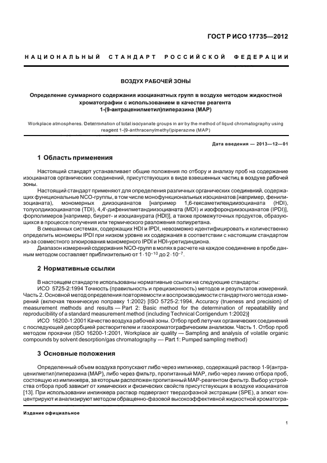 Настоящий стандарт устанавливает общие положения по отбору и анализу проб на содержание изоцианатов органических соединений, присутствующих в виде взвешенных частиц в воздухе рабочей зоны.