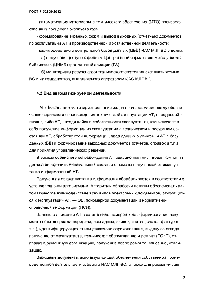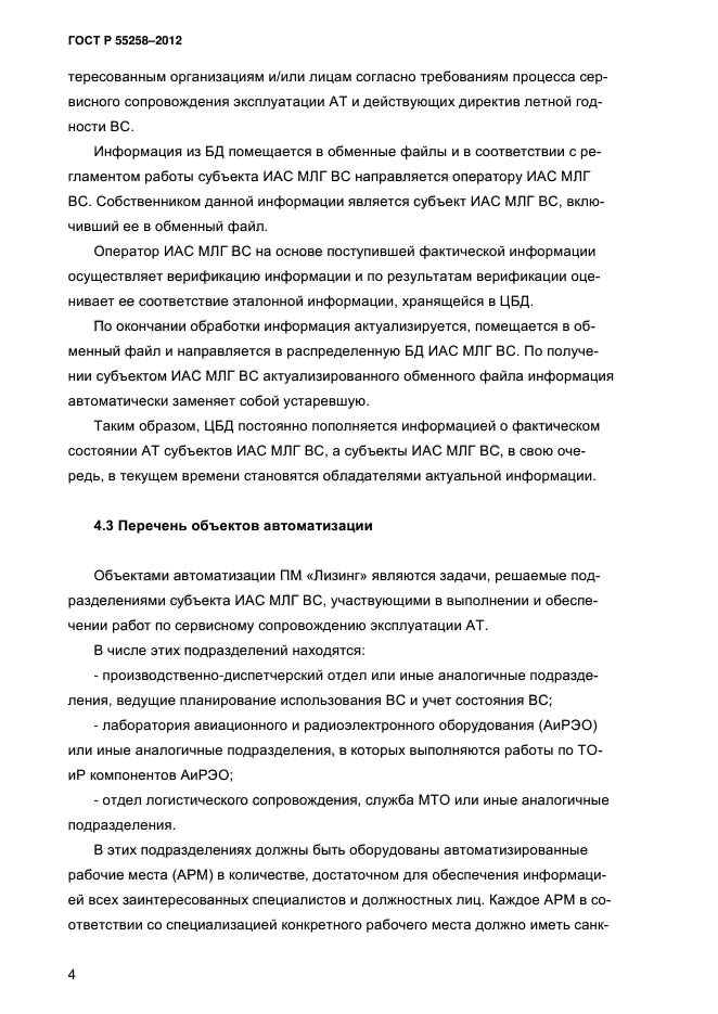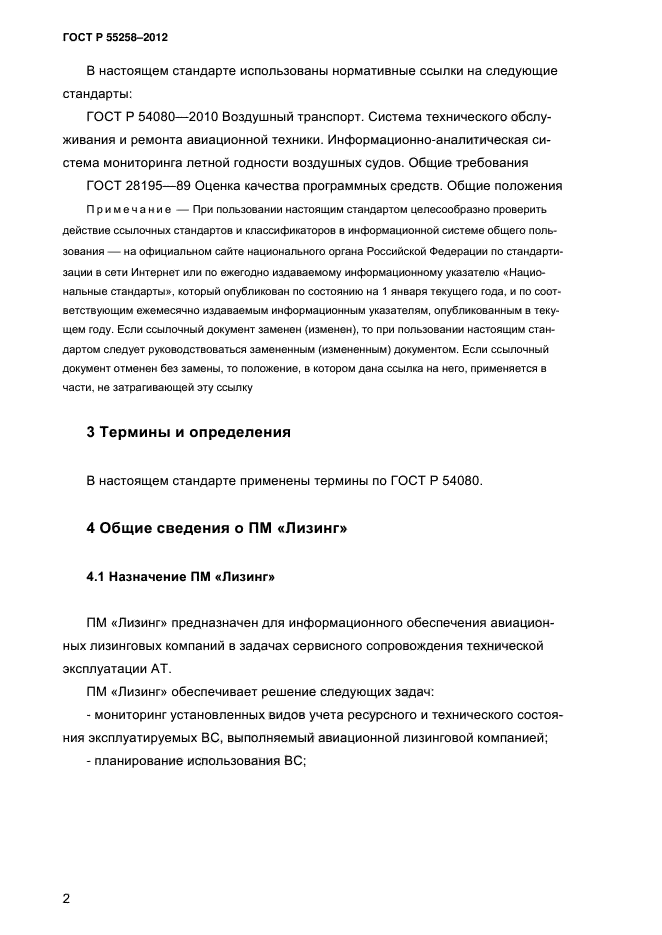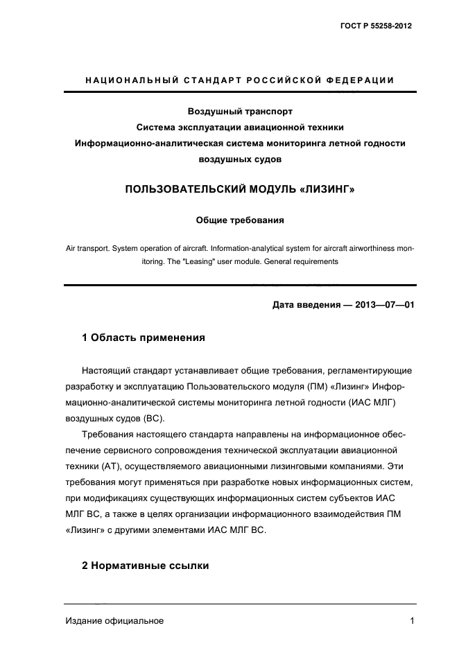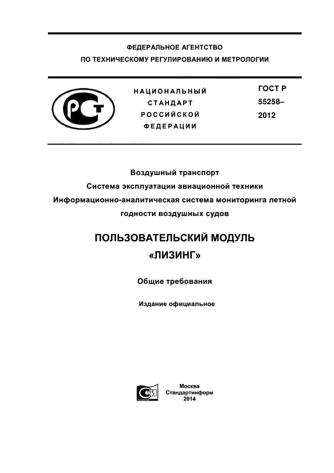 | Область и условия применения: | Настоящий стандарт устанавливает общие требования, регламентирующие разработку и эксплуатацию Пользовательского модуля (ПМ) «Лизинг» Информационно-аналитической системы мониторинга летной годности (ИАС МЛГ) воздушных судов (ВС).
