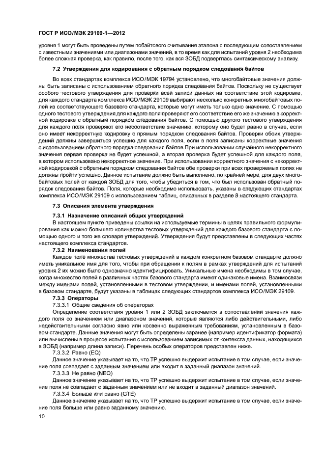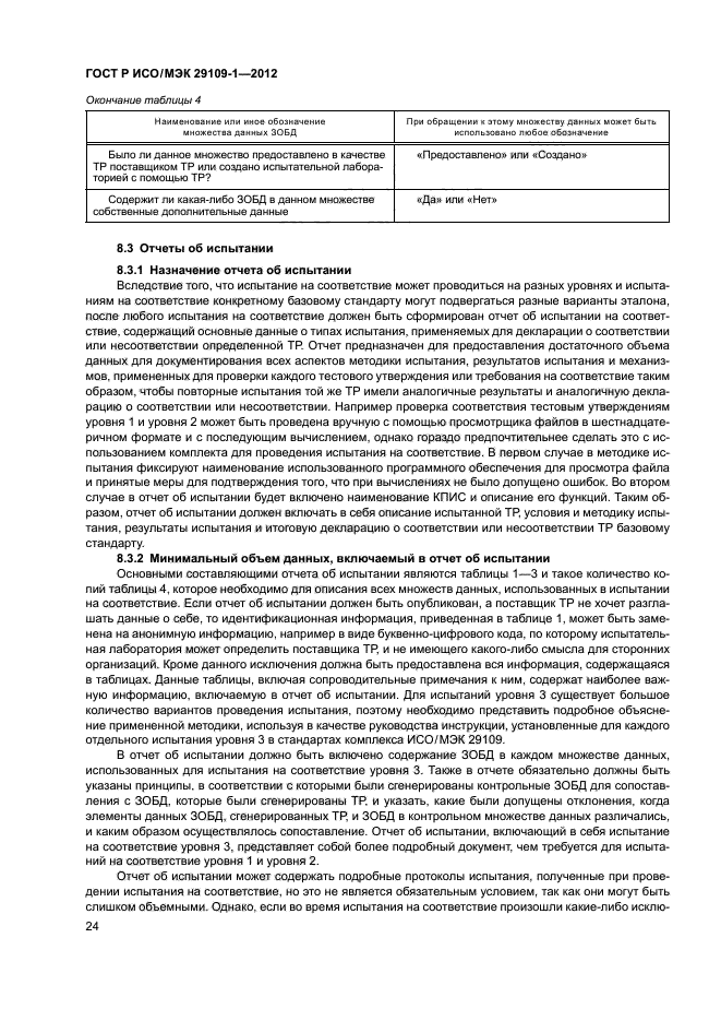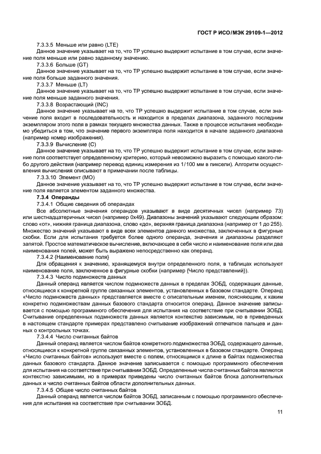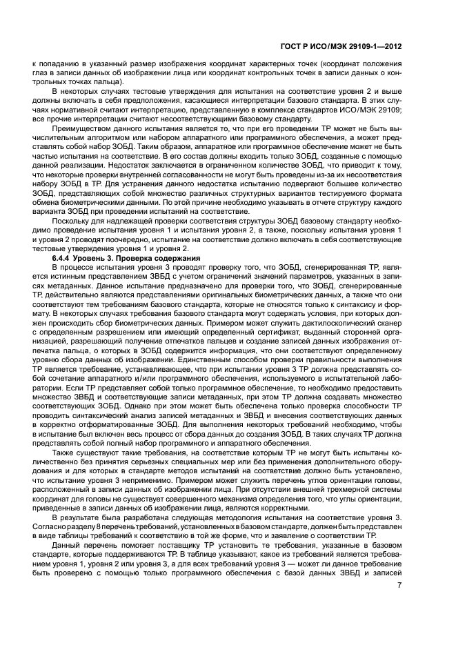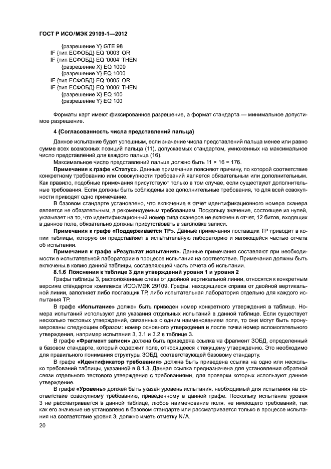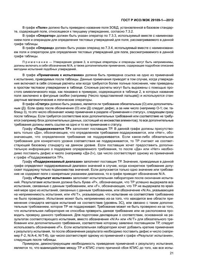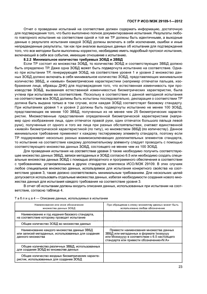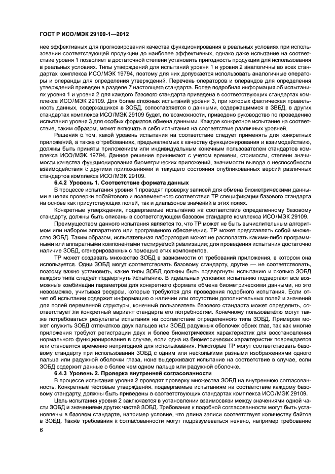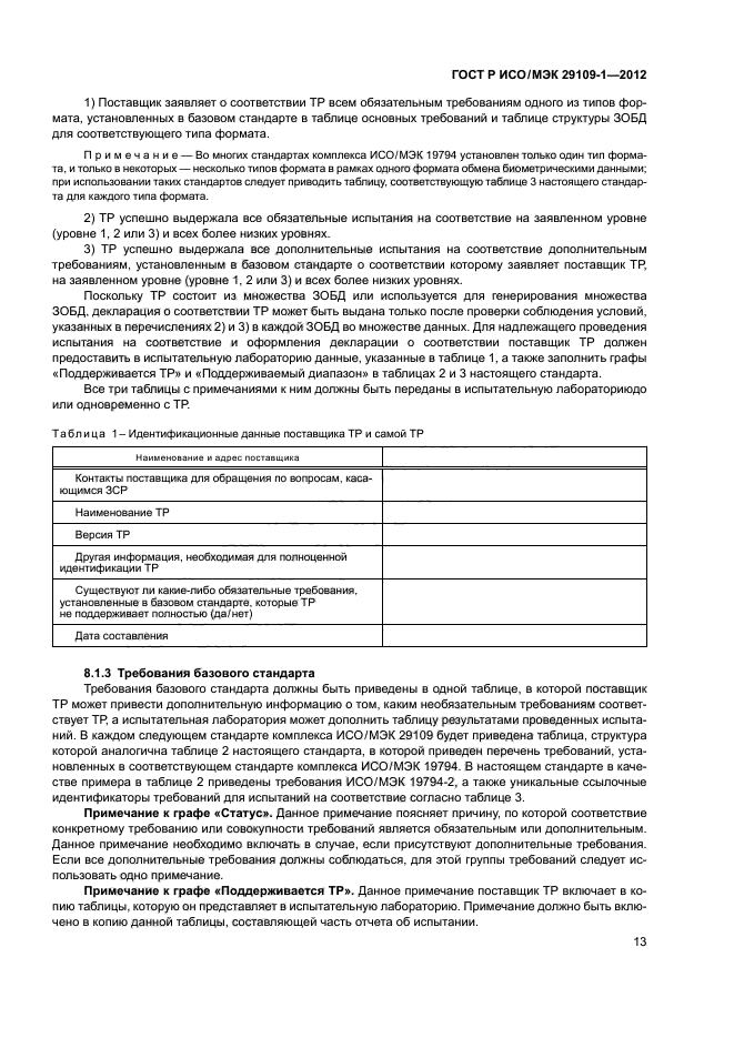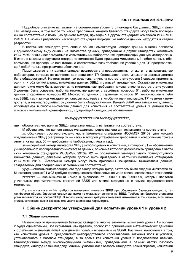 - подробное описание элементов испытаний и утверждений и описание любых обязательных стандартных наборов данных, необходимых для испытания, которые определены в других стандартах комплекса ИСО/МЭК 29109, каждый из которых устанавливает требования к испытаниям на соответствие базовому стандарту;