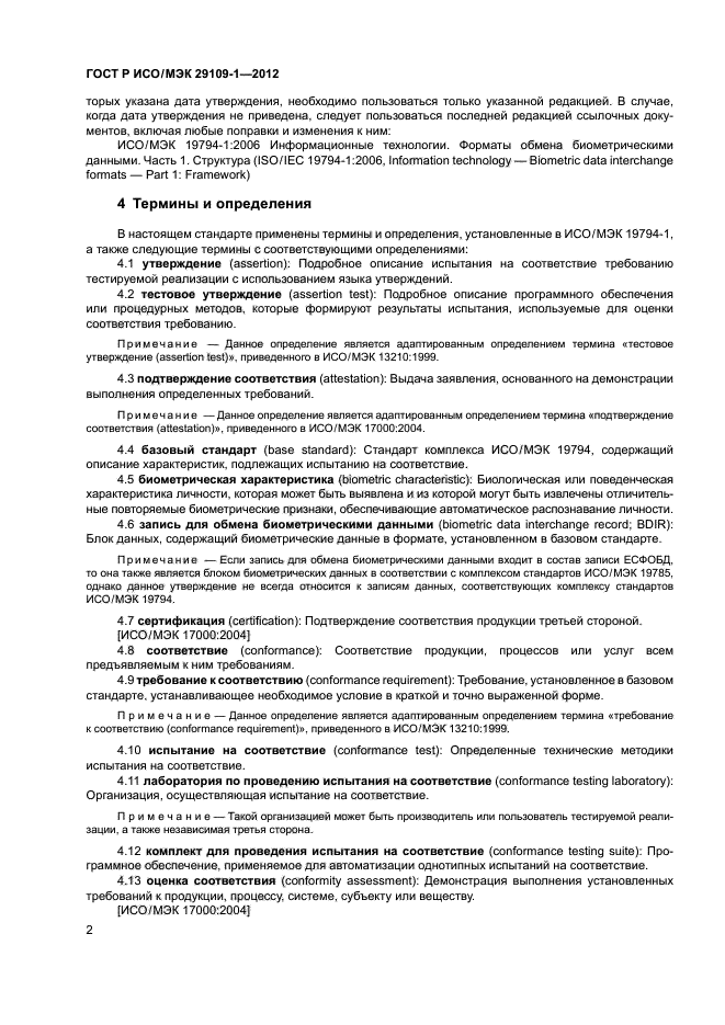 Также настоящий стандарт не распространяется на: - подробное описание элементов испытаний и утверждений и описание любых обязательных стандартных наборов данных, необходимых для испытания, которые определены в других стандартах комплекса ИСО/МЭК 29109, каждый из которых устанавливает требования к испытаниям на соответствие базовому стандарту; - проверку того, могут ли тестируемые реализации, претендующие на использование соответствующих записей для обмена биометрическими данными, корректно обрабатывать подобные записи для обмена биометрическими данными (испытание типа В) |
