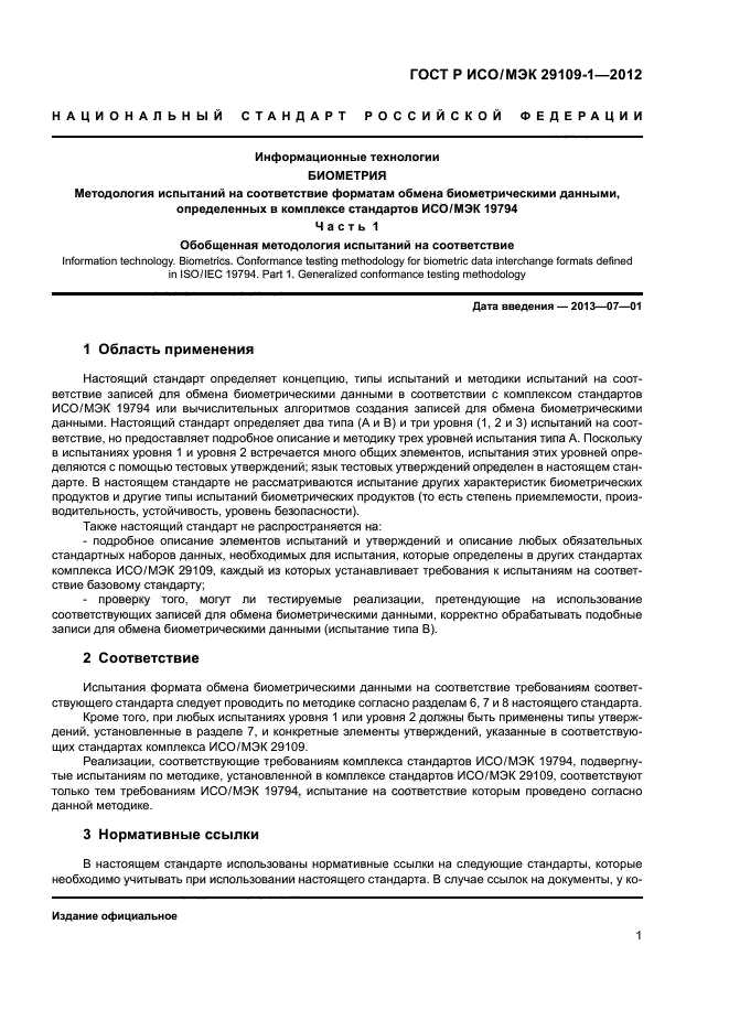 Настоящий стандарт определяет концепцию, типы испытаний и методики испытаний на соответствие записей для обмена биометрическими данными в соответствии с комплексом стандартов ИСО/МЭК 19794 или вычислительных алгоритмов создания записей для обмена биометрическими данными. Настоящий стандарт определяет два типа (A и В) и три уровня (1, 2 и 3) испытаний на соответствие, но предоставляет подробное описание и методику трех уровней испытания типа А. Поскольку в испытаниях уровня 1 и уровня 2 встречается много общих элементов, испытания этих уровней определяются с помощью тестовых утверждений; язык тестовых утверждений определен в настоящем стандарте. В настоящем стандарте не рассматриваются испытание других характеристик биометрических продуктов и другие типы испытаний биометрических продуктов (то есть степень приемлемости, производительность, устойчивость, уровень безопасности).